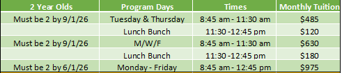 Enrolled 2-day Toddler 2s have the opportunity to add Lunch Bunch (11:30 am-12:45 pm) for an additional cost.